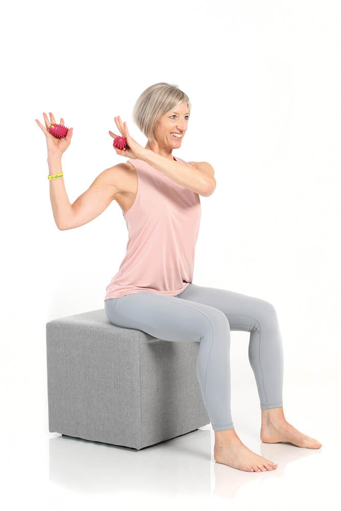 "Ich setze mich auf den MyBall und merke sofort die Beweglichkeit des Balles. Um nicht vom Ball zu fallen wird automatisch eine aufrechte Körperhaltung eingenommen. Durch das Bewegen mit dem Gesäß in verschiedene Richtungen halte ich ständig das Gleichgewicht und verbessere so meine Balance. In Rückenlage rolle ich Wirbel für Wirbel meinen Rücken ab und kräftige so meine Rückenmuskulatur. Möchte ich mich entspannen, lege ich mich einfach auf den Rücken, der Ball ist dabei unter meinen Unterschenkeln. Anschließend rolle ich den Ball nach links und rechts.“