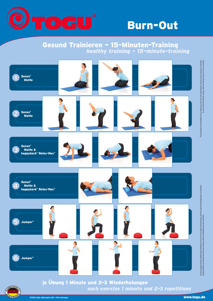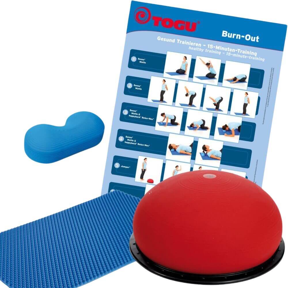 Das 15-minütige Anti-Burn-Out Programm (siehe auch Entspannungsprogramm), das Sie hier kostenlos online abrufen und einfach in Ihren Alltag einbauen können, bietet Ihnen eine solche Methode. Es ist auch für Untrainierte durchführbar. Durch den Einsatz des TOGU Geräte-Sets wird die Wahrnehmung angesprochen und leichte Massagereize gesetzt. Außerdem macht es Freude, auf dem luftgefüllten Jumper zu balancieren. Weitere Artikel, die Sie in dieser Kategorie finden, sind ebenso geeignet für die Anwendung in diesem Bereich.