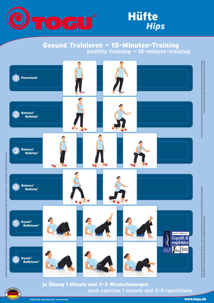 Das vom Teamarzt der deutschen Snowboard-Nationalmannschaft Dr. Sommer entwickelte 15-minütige Hüftprogramm, das Sie hier kostenlos online abrufen und einfach in Ihren Alltag einbauen können, beinhaltet solche Übungen. Es ist auch für Untrainierte durchführbar. Durch den Einsatz des darauf abgestimmten TOGU Hüft Geräte-Sets werden die Trainingsreize noch intensiviert. Weitere Artikel, die Sie in dieser Kategorie finden, sind ebenso geeignet für die Anwendung in diesem Bereich.