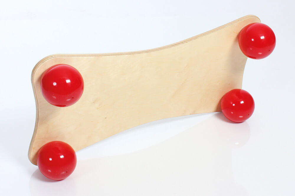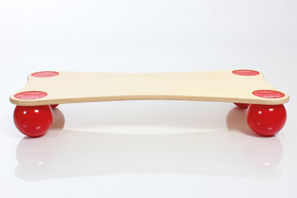 Mit vier Bällen unter dem Holzboard gibt er sowohl Menschen als auch Tieren die Möglichkeit in das sensomotorische Training einzusteigen und zu steigern.